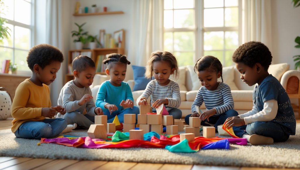 For the youngest children, focus on sensory-rich materials such as soft blocks, textured fabrics, and safe objects to explore with hands and mouths. Simple activities like stacking, filling and dumping, or pretend feeding lay the groundwork for later imaginative play.